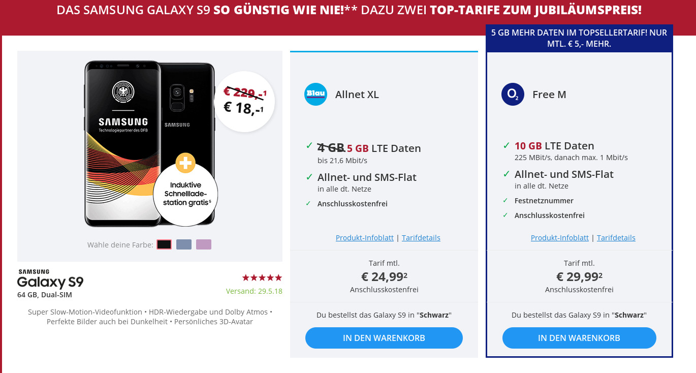 Für das Samsung Galaxy S9 mit 64 GB Speicher werden dann auch nur einmalige 18 Euro verlangt.